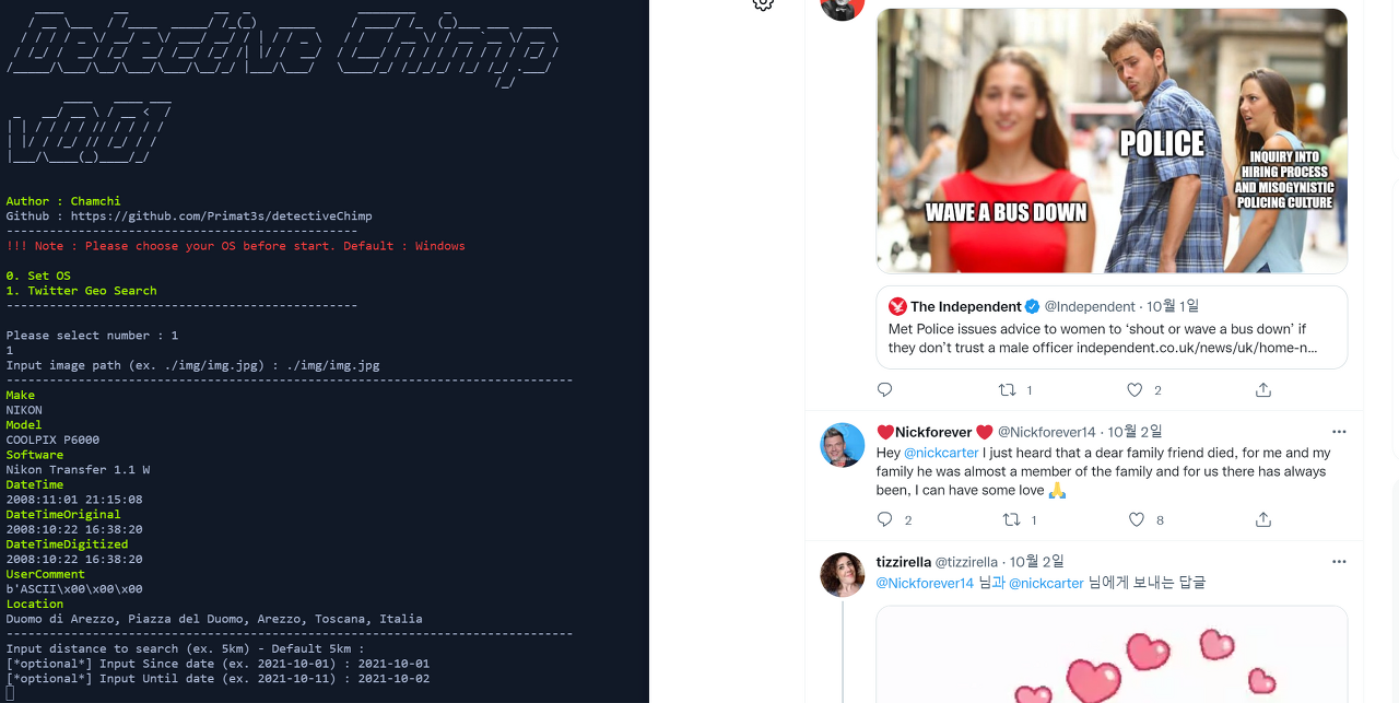 그러다 발견한 것이 트위터는 검색하는데 로그인이 따로 필요하지 않다는 것이였다. 그뿐만이 아니라 좌표값 및 날짜도 GET 메소드로 검색할 수 있었다. 그다지 어렵지않겠다 생각하여 이미지의 Exif 데이터를 받아와서 트위터에 검색하는 기능을 만들기로 결정했다.