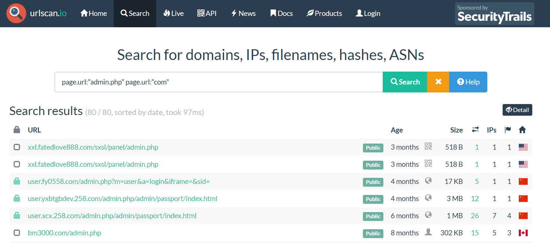 물론 이런 스캔자체도 꽤 도움이 되지만, 이를 통해 유출되는 개인정보 또는 민감한 페이지를 검색할 수 있다는 점이 흥미롭다. 아래는 admin 페이지가 유출되는 .com 으로 끝나는 사이트를 검색하는 쿼리다.